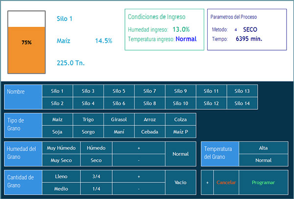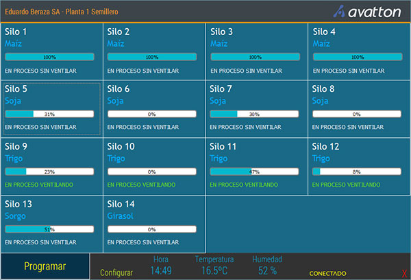 Monitoreo del estado del proceso de aireación programado por silo, en forma online las 24 horas desde cualquier parte del mundo.